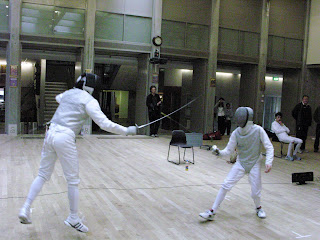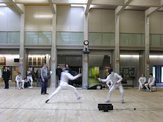 With 16 men there was a full tableaux, with all the men having to fight for their 1/4 final place. Steve Donati, another subsequently recruited Club des Artiste fencer was a pre tournament favourite. However his poule results placed him in the middle of the field so he had tough bouts from the first. His first opponent, Vittorio Spadadavecchia may not move on the piste as well as Steve, or be as easy to spell, but he makes up for it in strength and competitiveness. 8th after the poules, he powered his way into the quarter final against Christian Chilton. Christian, another fencer fancied for the title, finished the pouled as top seed had an easy first round match, but then found Vittorio, a frequent sparring partner on Thursday nights, sterner competition. It went right to the wire, before Vittorio took the bout 15-14.